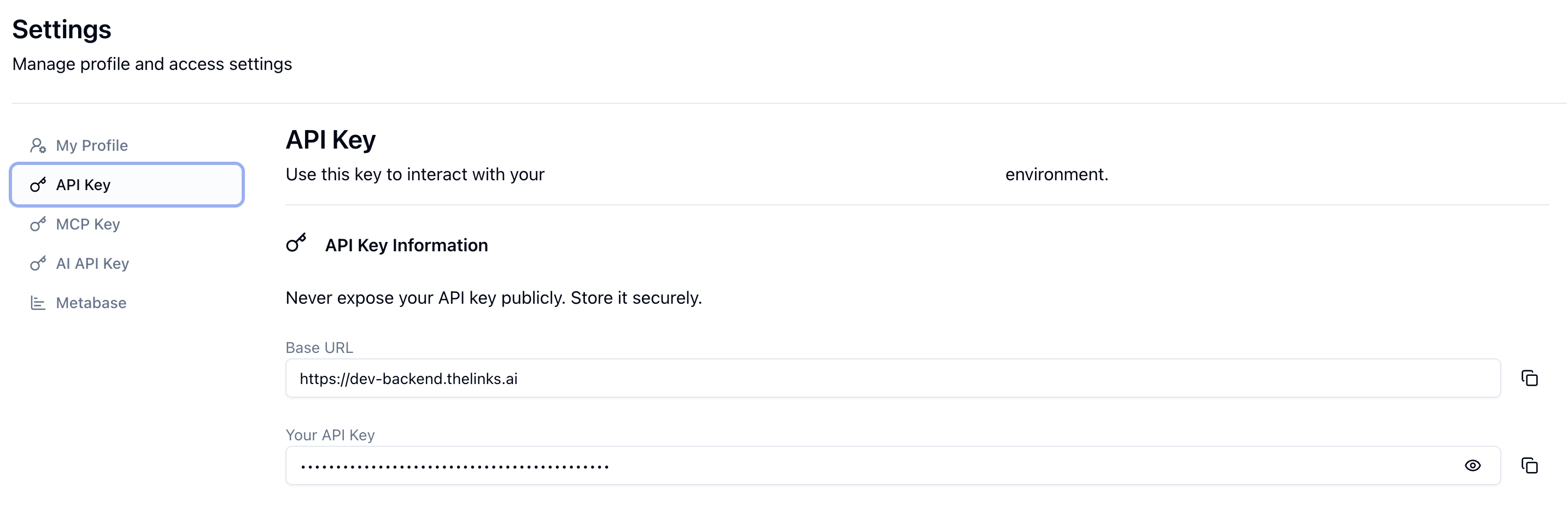 You will see your API Key hidden for security. Click the Copy button (often represented by a clipboard or eye icon) to reveal and copy the string to your clipboard.